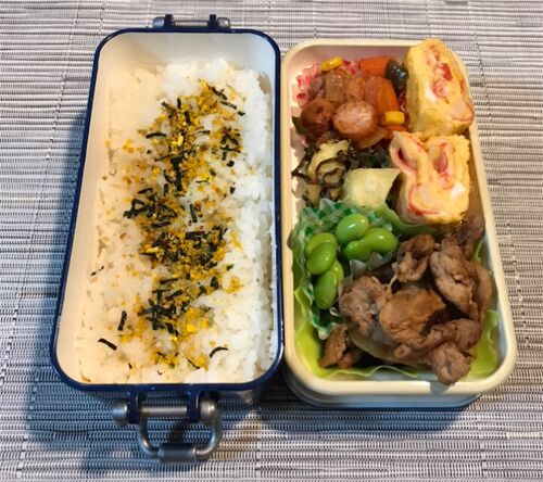 今日の弁当 1031 ・豚肉とれんこんのピリ辛きんぴら ・カニカマ入りたまご焼き(藤井弁当) ・ナポリタン ・レンチンじゃがいものマヨ塩こんぶ和え ・枝豆 ・ごはん(のりたま) 枝豆入りたまご焼きにしようと解凍している途中で、やっぱりカニカマ入りにと…