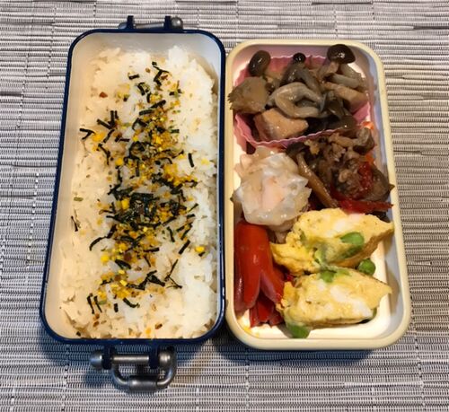 今日の弁当 1011 ・シャケときのこのみそレンジ蒸し ・牛肉とパプリカのしぐれ煮 ・枝豆入りたまご焼き ・タコさんウインナー ・えびシューマイ(冷凍食品) ・ごはん(のりたま) 昨日はサブでしたが、シャケときのこのみそレンジ蒸しがメインに昇格。きの…