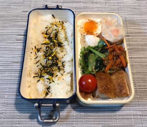 今日の弁当 1130 ・照り焼きチキン ・きんぴらごぼう ・小松菜のナムル ・ゆで卵 ・えびシューマイ(冷凍食品) ・ミニトマト ・ごはん(のりたま) やっぱりゆで卵を入れると彩りがよくなる。 サラダエレガンスをかけてみた。 のりたまは開封したばかりだか…